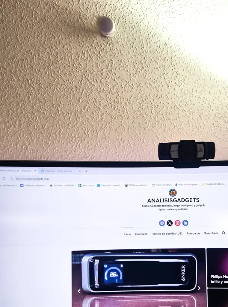 La solución fue simple: lo moví a la parte posterior de la habitación, cerca de la puerta. Ahí el sensor no “salta” hasta que pasas por delante, pero como responde rápido no es problema. Desde que lo cambié, no he vuelto a tener problemas: el funcionamiento ha sido perfecto y el ordenador ya no le afecta (imagino que al alejarlo un poco se resuelve). El sensor de iluminación también me ha funcionado bien porque automatizo luces según la iluminación real de la habitación. Y el sensor de temperatura me ha venido bien para controlar la temperatura de la estancia.