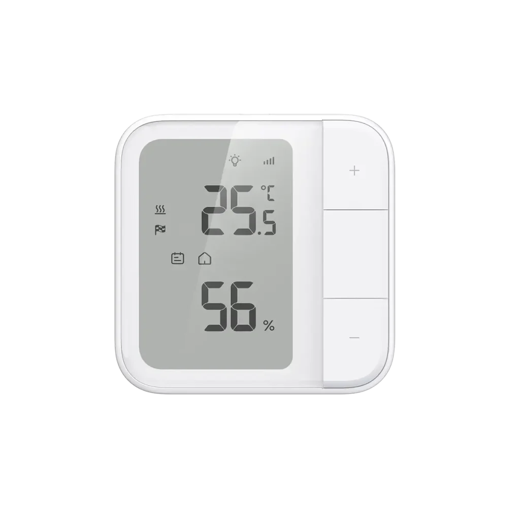 El termostato cuenta con una pantalla clara que muestra en tiempo real la temperatura ambiente, la humedad relativa y otros parámetros relevantes. Incorpora botones físicos que permiten un uso directo sin necesidad de app, y además permite: