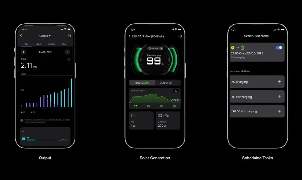 Aquí EcoFlow quiere diferenciarse de las típicas baterías que solo tienen enchufes. Toda la serie DELTA 3 Max viene con control desde la app (OASIS 3.0): ves en tiempo real el estado de la batería, cuánta energía estás consumiendo, cuánta estás cargando desde pared, panel solar o alternador del coche, y la estimación de coste y ahorro según el precio de la luz. También puedes programar cargas y descargas para que la estación se cargue cuando la electricidad es más barata (por ejemplo, madrugada en tarifas con discriminación horaria) y descargue durante las horas más caras, actuando como un pequeño “buffer” doméstico para arañar factura eléctrica. La app incluye modos como “Self-Powered” y tareas programadas para que esa lógica se ejecute sola sin que tengas que acordarte cada día.
