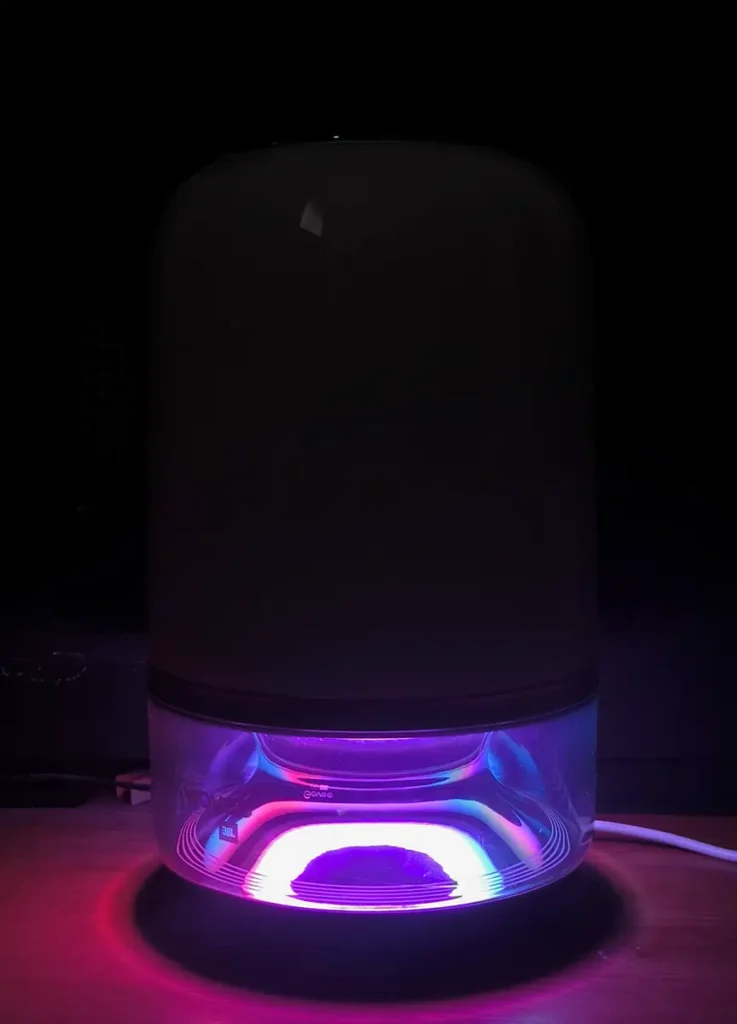 La calidad general es correcta, sin más. Suena bien para lo que es, pero no vas a tener la calidad de un altavoz dedicado. Además, hay que tener en cuenta varias limitaciones importantes: funciona únicamente por Bluetooth, no tiene AirPlay, no puedes manejar el sonido desde la aplicación ni ajustar ningún parámetro de audio, y además el altavoz es mono. La parte positiva es que, si conectas dos unidades, Govee anuncia el emparejamiento estéreo entre ambas y la documentación asociada al modelo menciona soporte de Wi-Fi de 5,8 GHz para ese modo estéreo, así que no se trata solo de enlazarlas por Bluetooth.