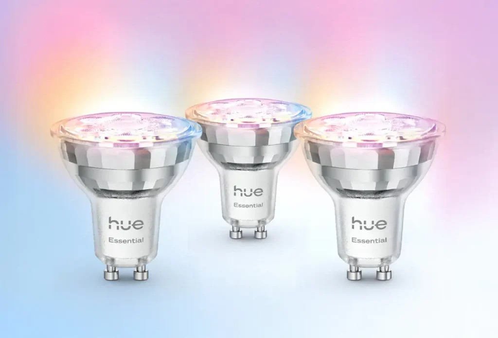 Para quien prioriza el precio sin renunciar a la experiencia Hue, Hue Essential se sitúa como gama de entrada con modelos E27 y GU10 en White Ambiance y Color. Mantiene Zigbee + Bluetooth y la compatibilidad con asistentes a través del Bridge, pero no incorpora el nuevo rango de 1.000–20.000 K.