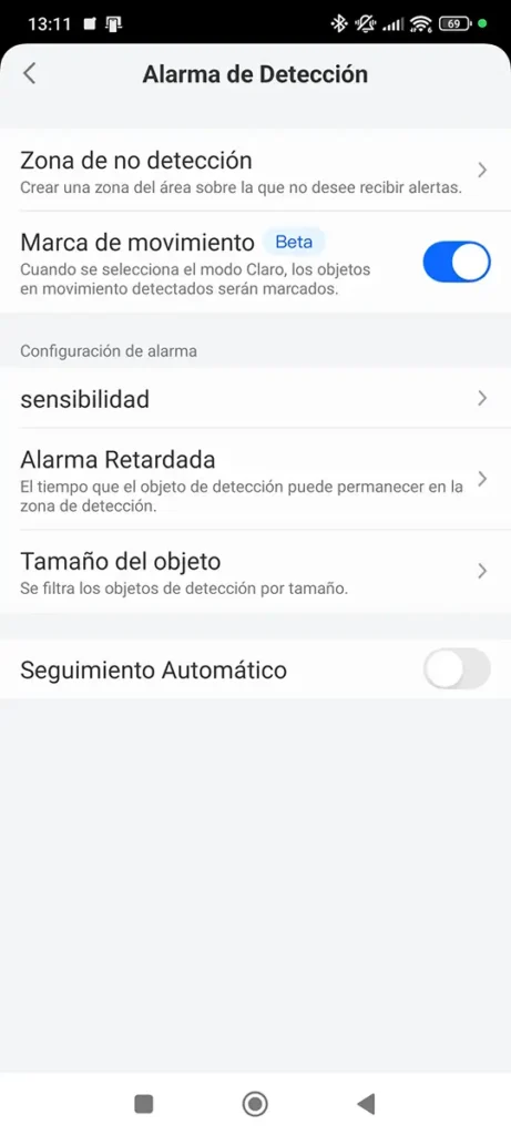 En el menú de Alarma de detección es donde se afinan muchos comportamientos para evitar falsas alertas y para que el seguimiento funcione como tú quieres.