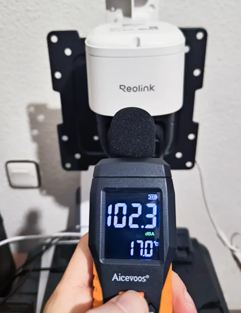 En cuanto a la alarma sonora, he realizado pruebas con un sonómetro y da alrededor de 102–105 dB a corta distancia, por lo que la sirena de la Reolink TrackMix PoE llama bastante la atención.