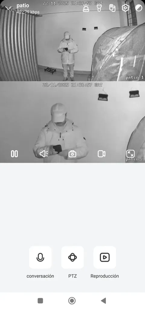 En el apartado de audio, la cámara cumple en una dirección y flojea algo en la otra. El sonido que recoge el micrófono se escucha relativamente bien, pero cuando hablas tú a través del altavoz integrado, la calidad es floja: la voz suena bastante metálica y cuesta entender lo que se dice, sobre todo si hay ruido ambiente. Además, en mis pruebas he notado alrededor de un segundo de retraso en el audio, de forma que la conversación no es del todo natural. Un pequeño truco para mejorar el sonido es bajar un poco el volumen del altavoz desde la app; así se reduce la distorsión y se entiende mejor lo que dices.