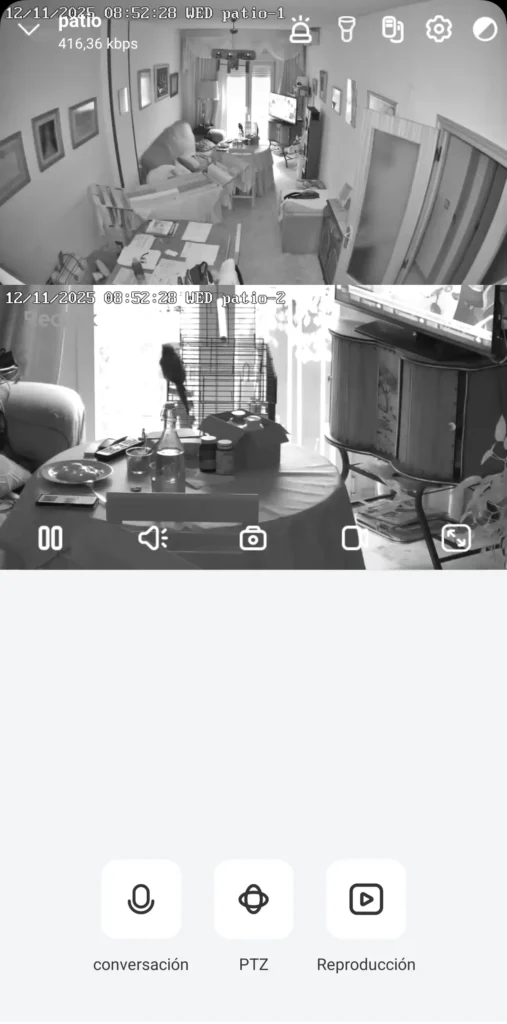 A nivel práctico, este doble enfoque se nota mucho. Por ejemplo, puedes tener la lente gran angular cubriendo todo el acceso a la vivienda, mientras que la lente de zoom se centra en la zona donde aparcas el coche o en la puerta del garaje para leer matrículas. En interior, puedes ver toda la habitación y a la vez dejar el zoom “clavado” en la cama del perro o en la jaula de tu mascota.